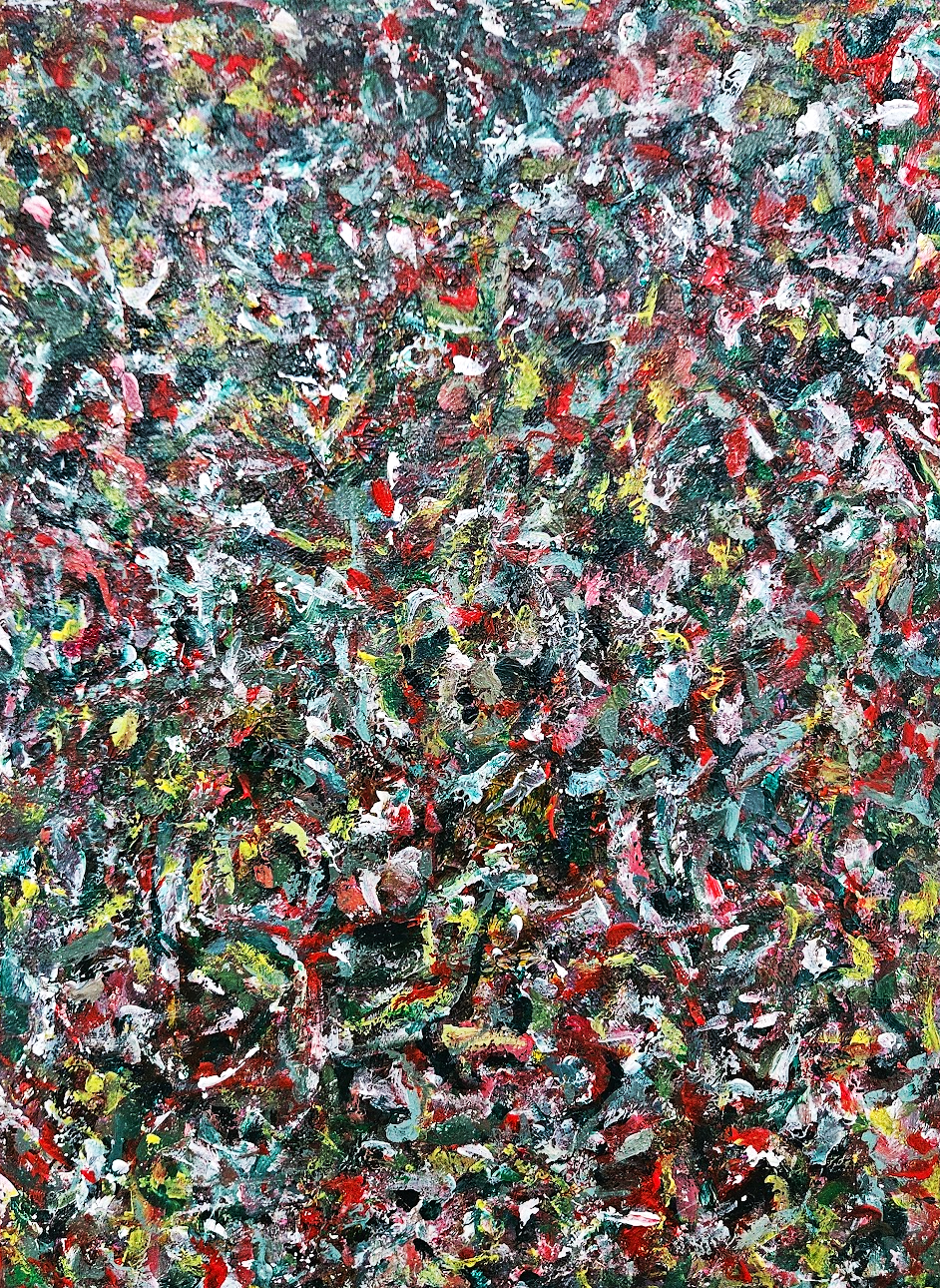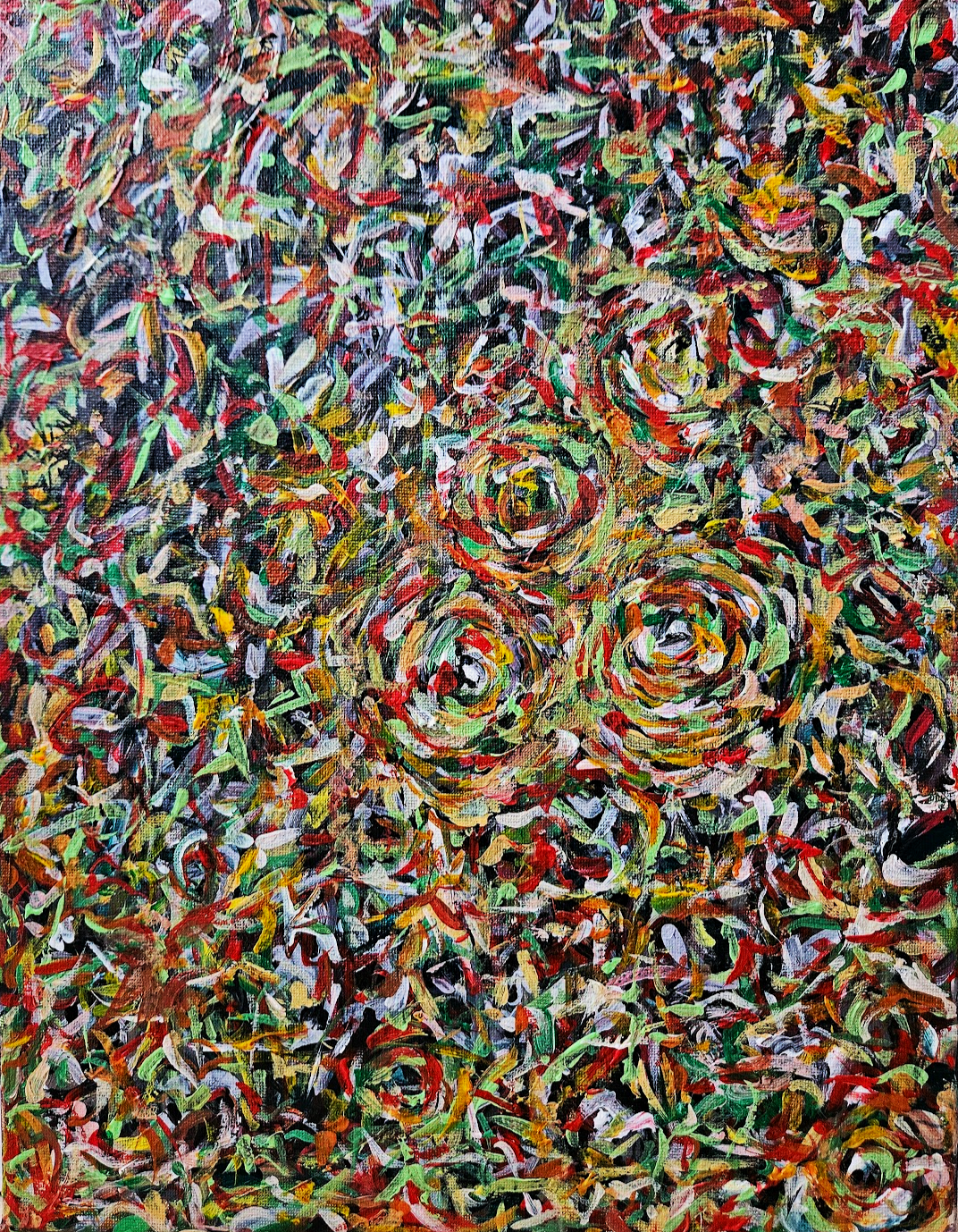 Built in a state of urgency, this work reads as overgrowth - circular systems surfacing through dense, repetitive gestures. Colour operates as pulse rather than decoration: green disrupted by flashes of red and white, creating a body-like system in heightened activity. What appears chaotic is, for the artist, an act of self-organisation. The work appears volatile, yet operates as a private architecture of order.